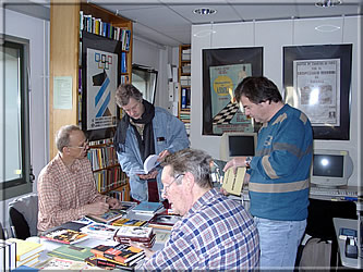 Detlef Krämer (rechts) aus Köln besuchte den MEC-Büchermarkt zum ersten Mal, links (mit Blick in die Kamera) Calle Erlandsson. -