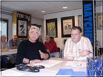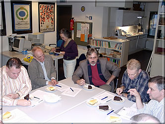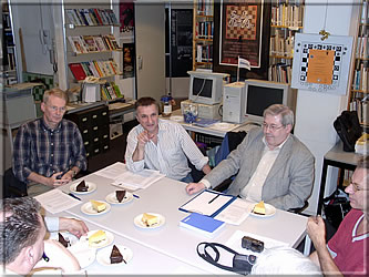 Auftakt zur KWA-Vorstandssitzung, die sich überwiegend dem Lasker-Buchprojekt widmete. Tony Gillam (links) berichtete über seine Nachforschungen zu Laskers England-Aufenthalten, kleine Lücken in Laskers Lebenslauf (1902!) bedürfen noch weiterer Suche und der vergleichenden Prüfung verschiedener Quellen. Peter de Jong (oben rechts) referierte über Lasker aus holländischer Sicht, er konnte uns erstaunliche Befunde über Laskers Leben in den Niederlanden präsentieren. Die bisherigen vielversprechenden Ergebnisse lassen es erwarten, dass 2008 eine in weiten Teilen "umgeschriebene" Lasker-Biographie erscheinen wird! -