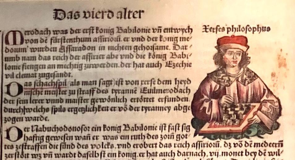 Ob es eine Beziehung zwischen Jacobus de Cessolis mit seiner Schachpredigt (Liber de moribus hominum et officiis nobilium ac popularium super ludo scacchorum, etwa „Buch der Sitten der Menschen und der Pflichten der Vornehmen und Niederen, vom Schachspiel abgeleitet“) und der Weltchronik mit Xerxes am Schachbrett gibt und falls ja, wie sich diese nachweisen lässt.