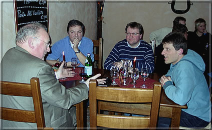 Hier waren die Themen zur frühen Morgenstunde trotz ernster Mienen weniger ernsthaft, sondern eher (wein-)geistreich: von links Paul Werner Wagner, Jurgen Stigter, Raj Tischbierek, Matthias Deutschmann und ein Freund von PWW.