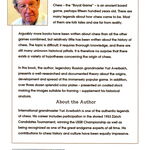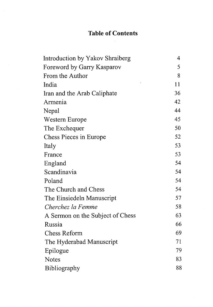 The cover text verso and the Table of Contents give an impression of the book which covers the evolution of chess from the very beginnings, and the author presents his own theory as to the origin of chess which is very plausible and to his own opinion "the closest one to the truth".