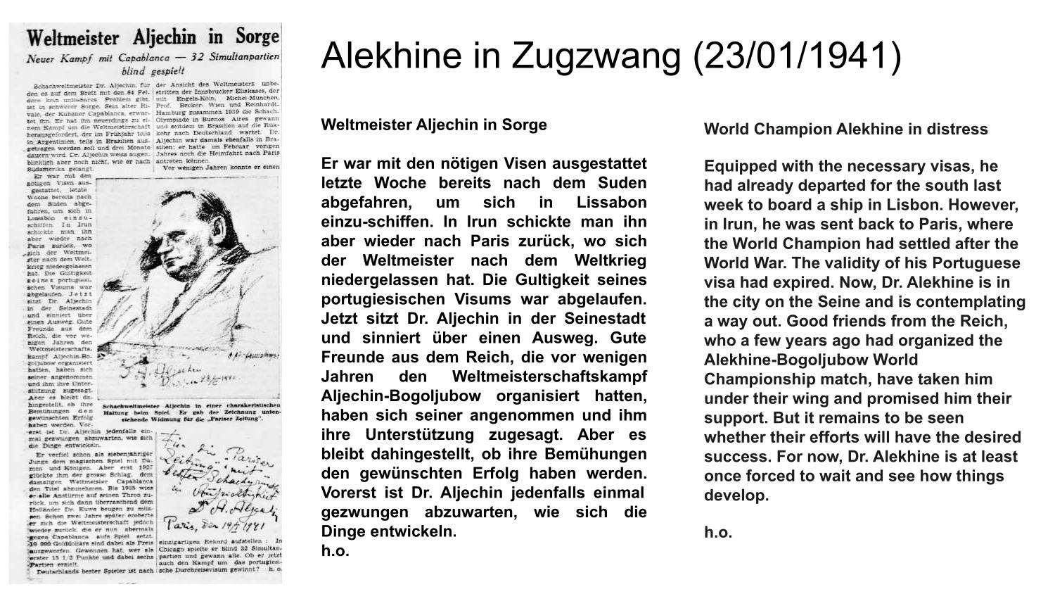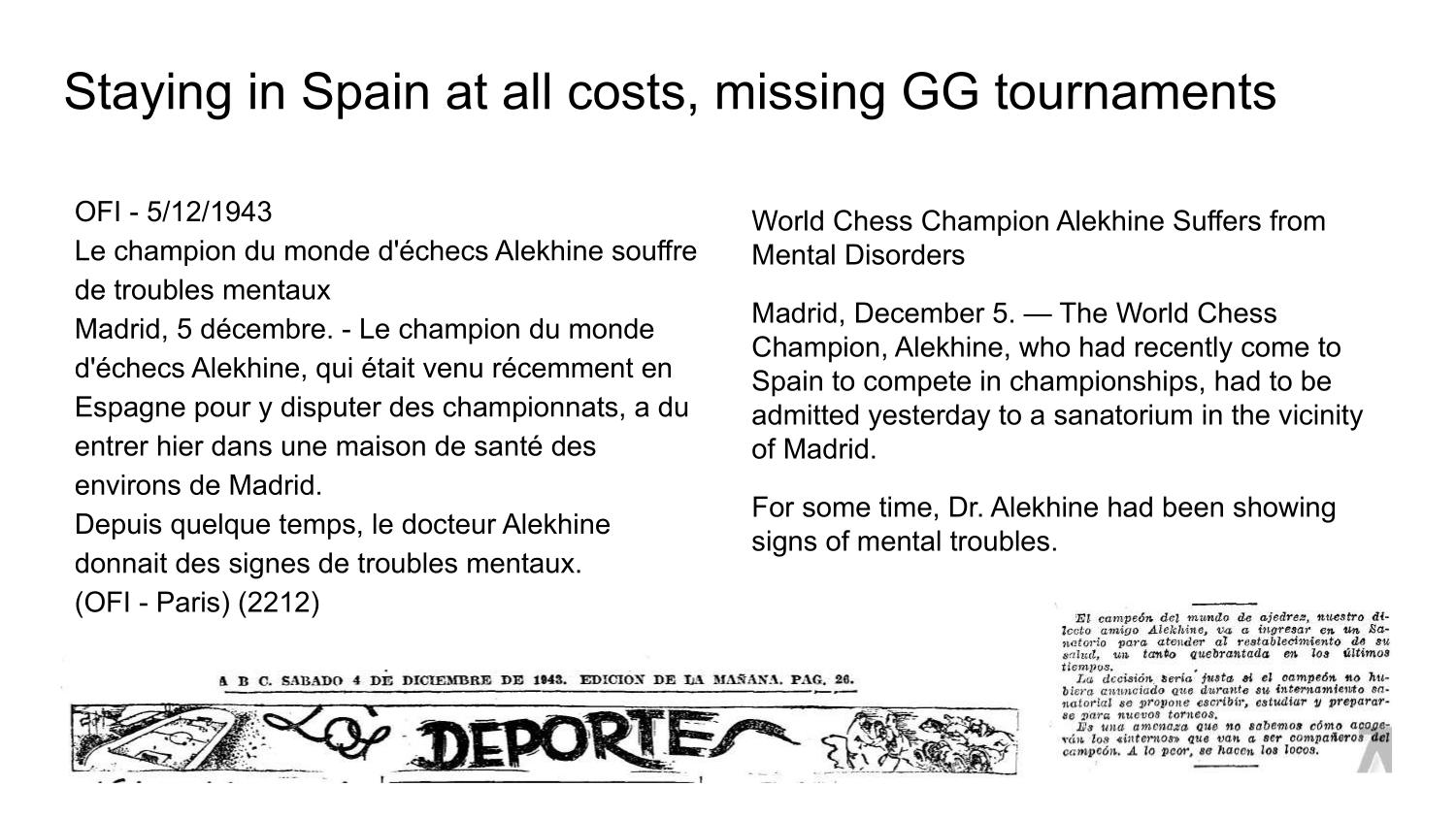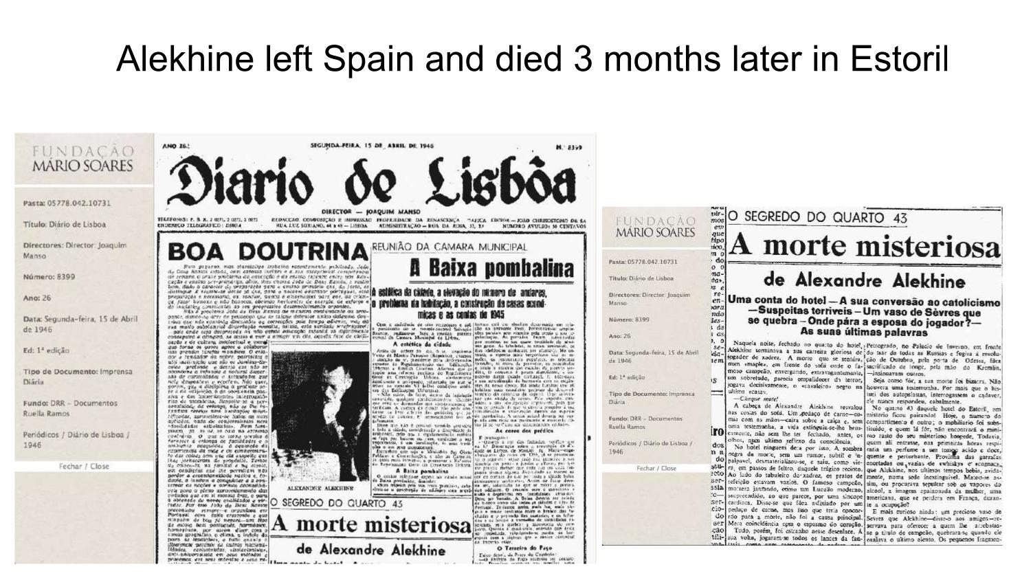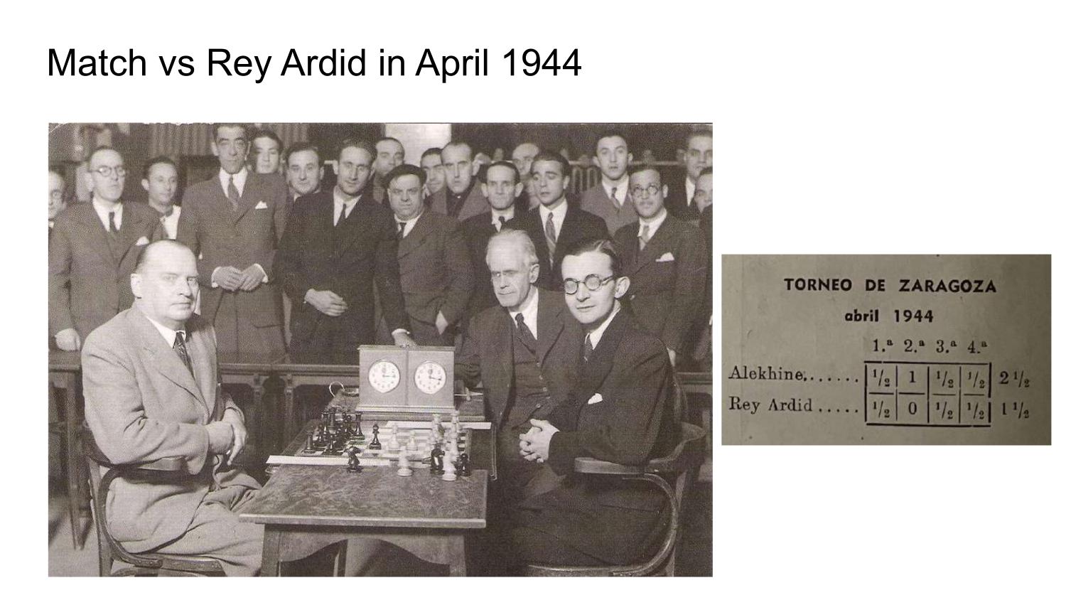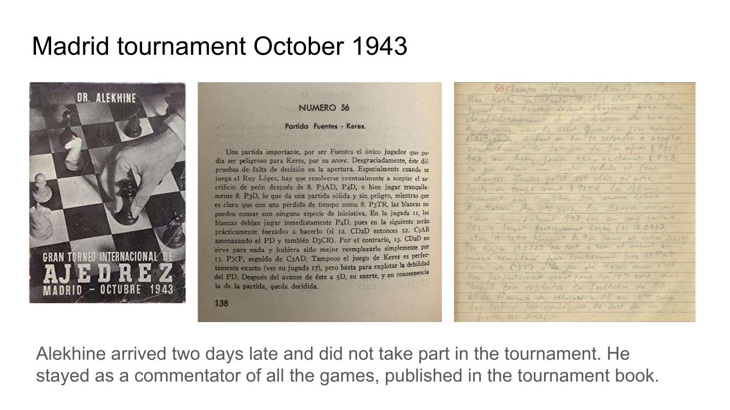 Denis Teyssou, an Alekhine specialist, recounted the final years of the fourth World Chess Champion's life, focusing mainly on his flight to Spain during the Second World War.