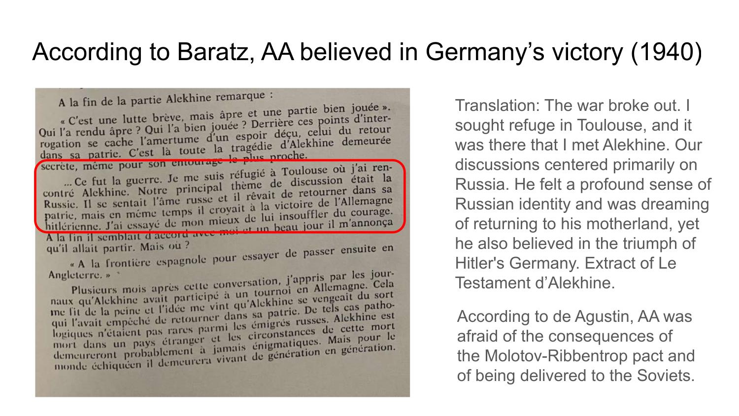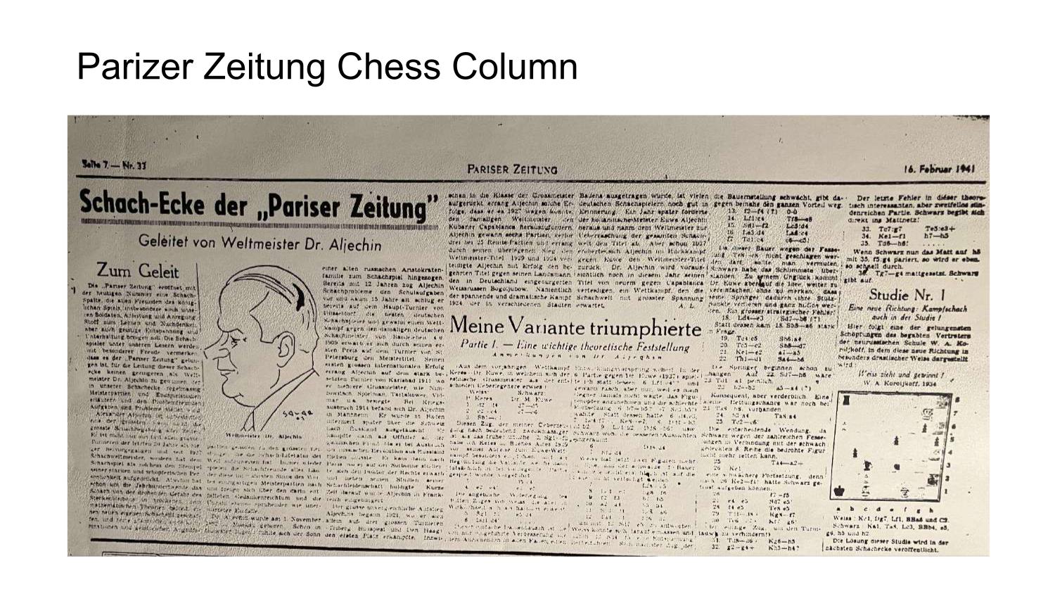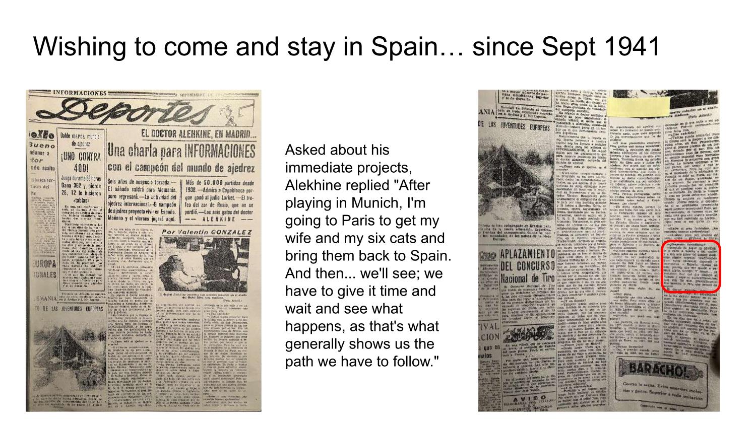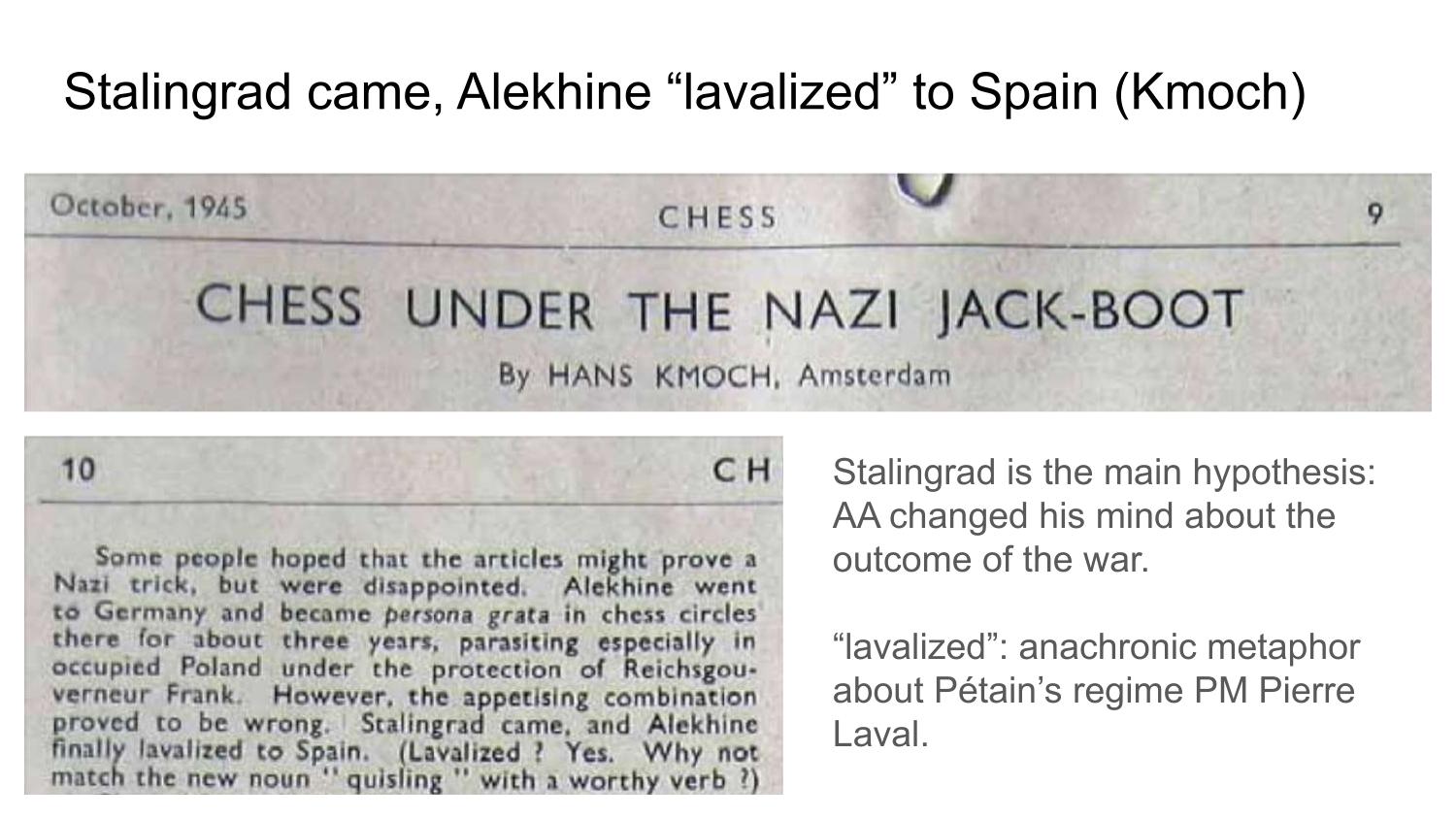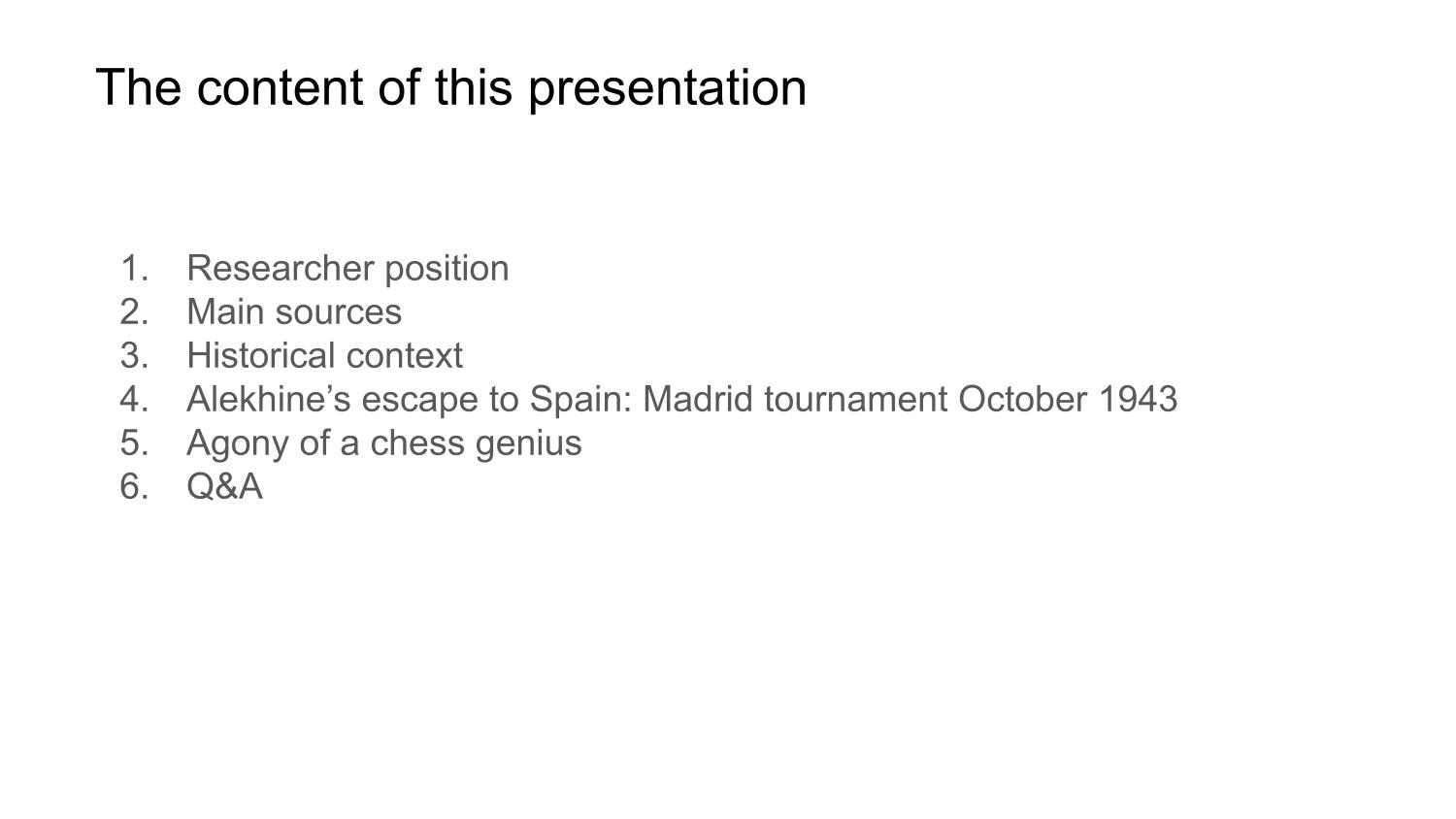 Denis Teyssou, an Alekhine specialist, recounted the final years of the fourth World Chess Champion's life, focusing mainly on his flight to Spain during the Second World War.