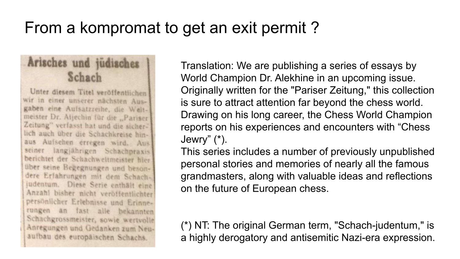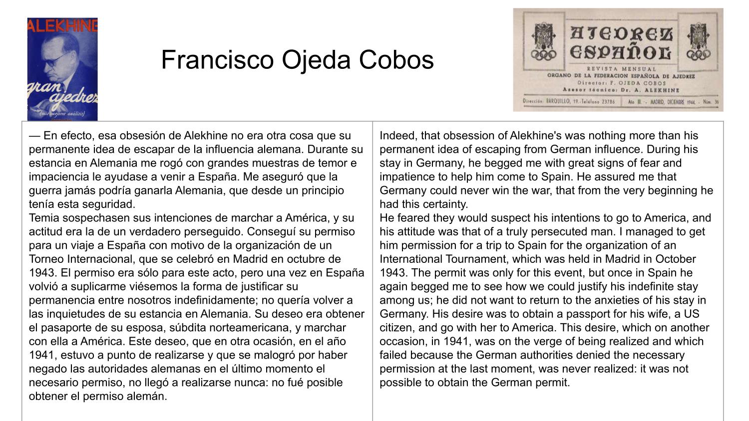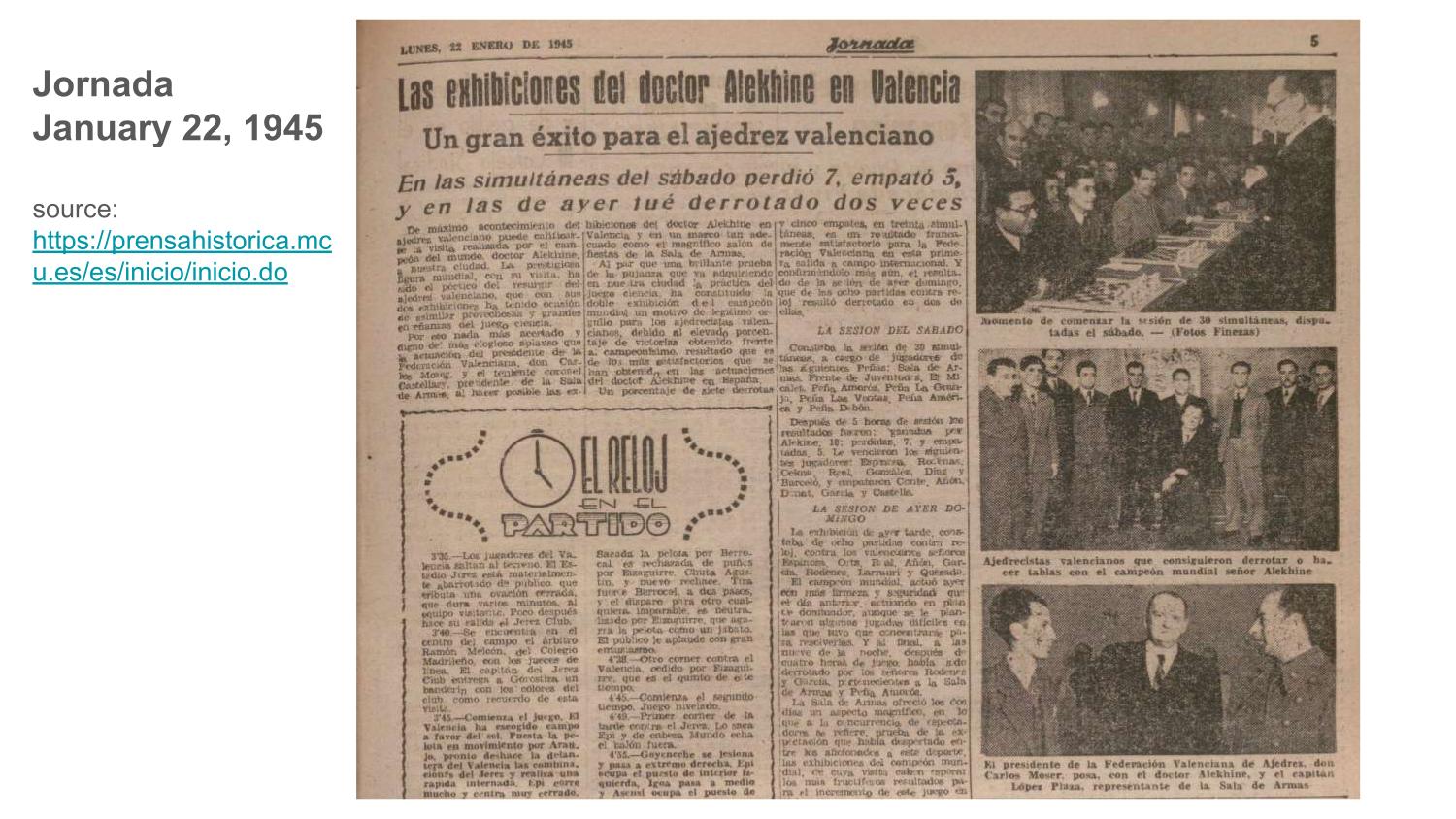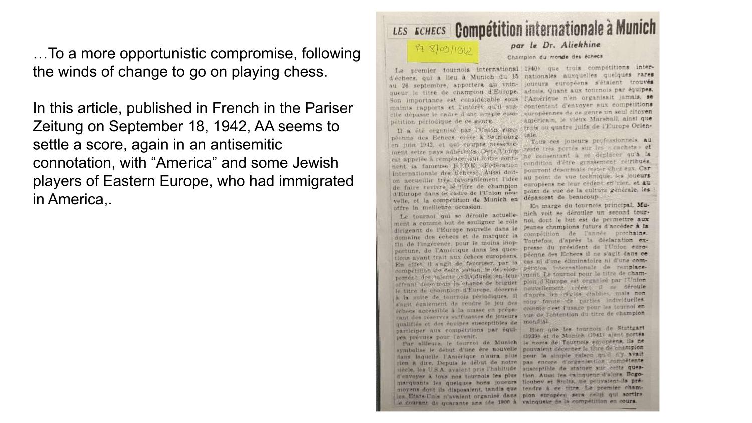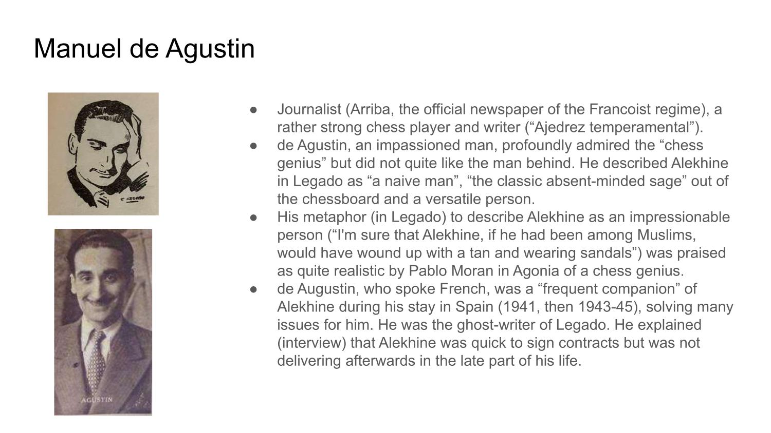Denis Teyssou, an Alekhine specialist, recounted the final years of the fourth World Chess Champion's life, focusing mainly on his flight to Spain during the Second World War.