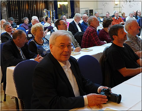 The following Friday evening the attendees initially met in the foyer of the ELEPHANT for a welcome drink (see photos above) before all went to the nearby restaurant "Zum weißen Schwan" to enjoy a joint evening meal. After the soup a first highlight of our meeting was already due, namely the official award of the "Deutsche Schachpreis 2014" to the cultural chess magazine KARL (see also KARL 2/2014). Sports director GM Uwe Bönsch had come as the representative of the German Chess Federation, he gave a speech in honor of Harry Schaack – editor and publisher of KARL – and presented him with the prize and the document, naturally with great éclat of the audience. Harry Schaack replied to the laudation with an acceptance speech in German and English.