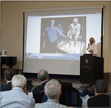 Ralf Niederhäuser, president of the Chess Federation North Rhine-Westphalia, showed entertainer qualities in his lecture "Chess – Sports, Culture or Entertainment?". During his talk Michael Negele could – to the amusement of the audience – still place an original "add-on": While Ralf Niederhäuser held forth about the Beatles song "Lucy in the Sky with Diamonds" and the anthropological find "Lucy" (in Ethiopia 1974), Michael quickly projected a photo of his "Lucy" onto the screen! (see photo below)
