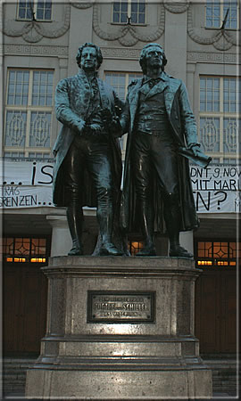 A town’s landmark: The Goethe Schiller monument on the Theaterplatz in front of the German National Theatre. The sculptor has formed both poets in the same size, although Schiller (about 1.82 m) was significantly taller than Goethe (about 1.70 m). -