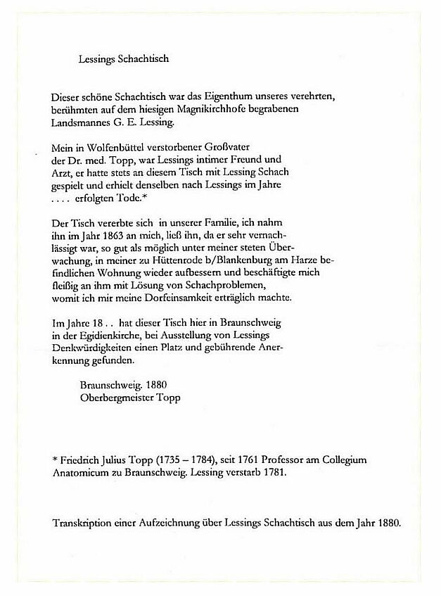 An exhibit of outstanding importance is the chess table of the German poet and philosopher Gotthold Ephraim Lessing (*1/22/1729 †2/15/1781), who lived in Wolfenbüttel from 1770 till his death and who worked as a full-time librarian in the Duke August Library. You may inspect here a transcription of notes about Lessing’s chess table from 1880. This letter was only recently discovered in private ownership and reached the library as a gift of the firm Klittich-Pfankuch: Lessing's Chess Table (in German only).