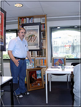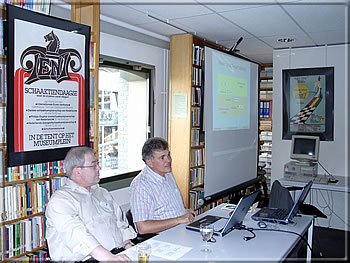 From 6 p.m. the Max Euwe-Centrum filled up literally to the very last seat, among the visitors was also GM Genna Sosonko who showed much interest in the activities of our association. Jurgen Stigter inaugurated the Ken Whyld exhibition and gave some explanations on the contents of the showcase, all those who will not get a chance to visit the MEC till March 2006 will gain an insight by our small slide show. Afterwards Alessandro Sanvito was reminiscent of Ken Whyld, his friend for many years, finding very personal words.