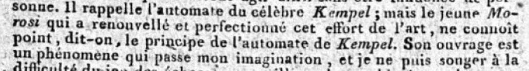 The Tuscan citizen Morosi, from his earliest youth, invented machines that place him among the greatest mechanics of this century. He had already built, in Italy, a chess-playing automaton, which the Grand Duke of Tuscany, who had paid for it (25 thousand francs), kept in his cabinet. The one that he has just executed in Paris, and that one sees rue des Poulies, opposite the colonnade, has not less perfection, although the author, for lack of pecuniary means, could not use the best materials. Several famous scientists and artists have seen the automaton and admired it. Among them are the illustrious Lagrange, the citizens Prony, Sylvestre and Breguet, watchmaker.