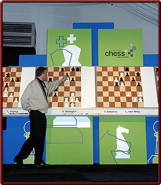 The both leading A's, Adams and Anand, only managed to leave behind one of five leaders, Peter Leko. The Hungarian grandmaster was unable to crack Vladimir Akopian's defence. The leading V's, Veselin Topalov and Vladimir Kramnik, did not slip. At first sight, Topalov seemed to be going straight for Viorel Bologan's king. When the Moldovan grandmaster held on, Topalov changed gears to reach a better endgame with a powerful White knight on c5. Guided by this knight, Topalov brought home two of his pawns, forcing resignation. Kramnik had to do even more work as Zhang Zhong was unwilling to cooperate.