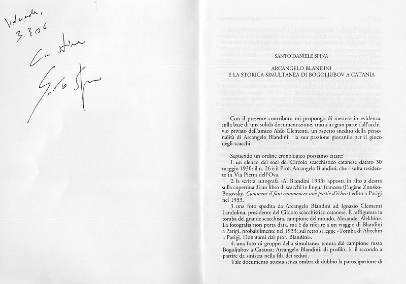 "Arcangelo Blandini and Bogoljubow's famous simultaneous exhibiton in Catania" (please click on the images below). You will find an additional extensive contribution of Santo Spina on Sicily’s chess history in the always recommendable magazine of our friend Romano Bellucci: "Indice bio-bibliografico degli scacchisti attivi in Sicilia (1500-1959)" in Scacchi e Szienze Applicate, fasc. 24 (2004), Venezia, May 2005, p. 24 ff – here is the English abstract (jpg-file).
